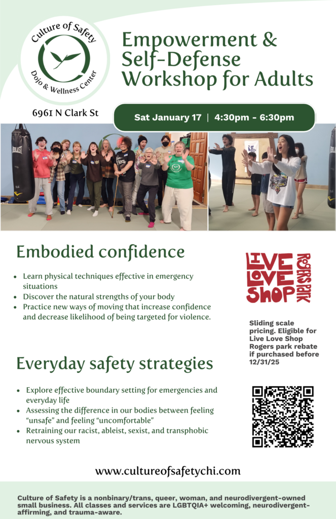 Join us Saturday, February 7th, 4:30 – 6:30 for our next Self-Defense workshop. Learn how to feel and be safer, stronger, and more self-confident through our empowerment-based workshop. This workshop for adults (age 18+) includes both physical resistance skills to slow down an attacker and get away to safety, as well as communication strategies to deter violence before it starts. Our workshops are always interactive, engaging, accessible for all bodies and abilities, and trauma-informed. Open to adults of all genders and gender identities. Register here.