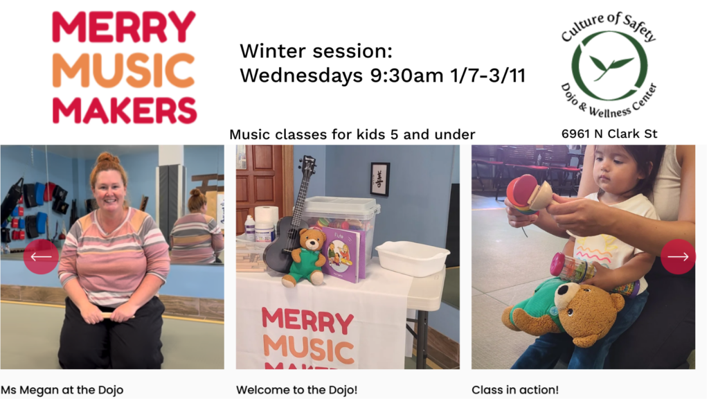 Merry Music Makers – Winter quarter music classes start Wednesday January 7th (9:30am) are are open to kids age 5 and under (and their caregivers). Classes are taught by our very own community member Megan Edwards (mother of Senpai Jay). You definitely want in on this!