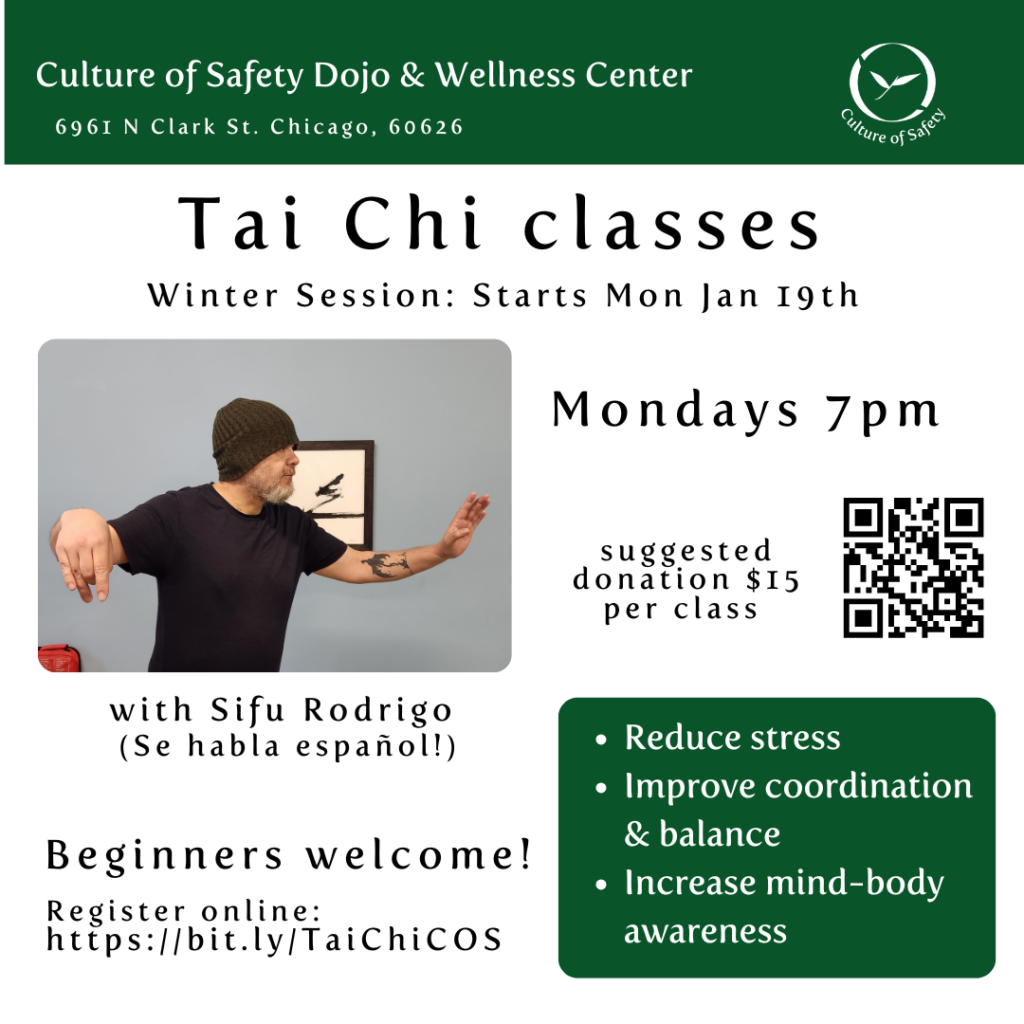 Tai Chi Classes – Sifu Rodrigo’s classes are back starting Monday January 19th! Tai Chi classes meet weekly Mondays at 7pm, starting Monday Jan 19th. All classes are drop-in, open to beginners. Suggested donation $15 per class. Learn more online or register to receive email reminders.